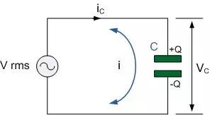 如圖1所示,以下研究僅存在電容和交流電源的電路。事實證明,電流和電壓之間存在90°的相位差,電流到達峰值比電壓到達峰值超前90° (1/4周期)。交流電源會產生振蕩電壓,電容值越大,為了在極板上建立特定的電壓,就必須流動越多的電荷,因此電流也就越大。電壓頻率越高,改變電壓可用的時間就越短,因此電流也就必須更大。因此,電流會隨著電容和頻率的增加而增加。